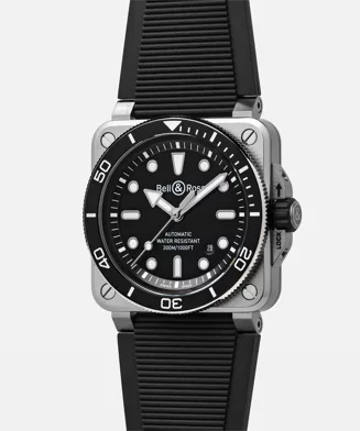 El BR-03 Diver Black Steel es un reloj que lleva la funcionalidad al siguiente nivel. Con una caja cuadrada de acero inoxidable satinado de 42 mm y una esfera negra altamente legible, esta pieza está construida para cumplir con las exigencias de los buceadores profesionales y aventureros modernos. Su diseño se inspira en los instrumentos de navegación y control aeronáuticos, sello distintivo de Bell & Ross, trasladado aquí al universo submarino.