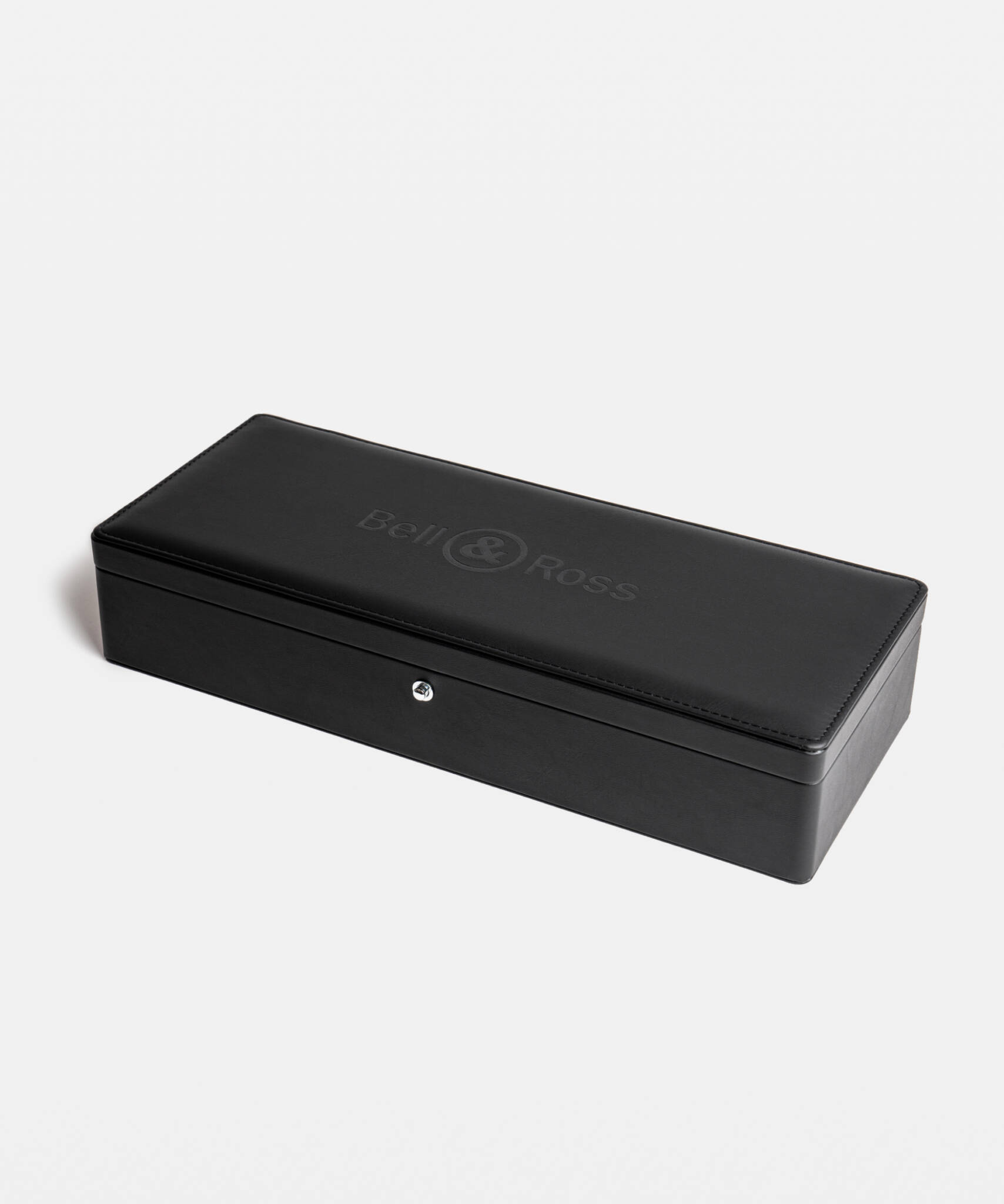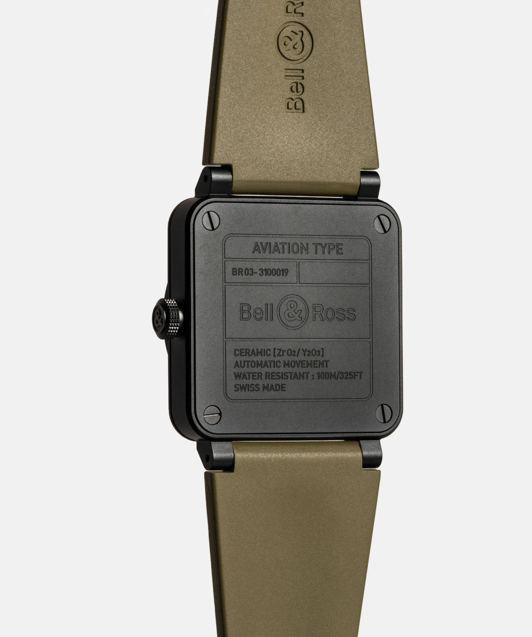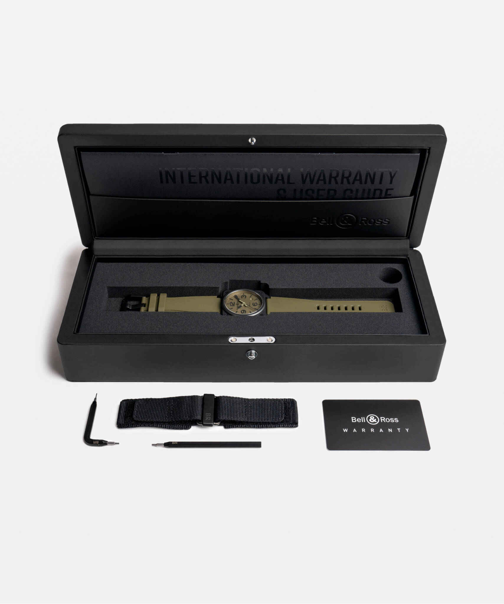 Caja de cerámica negra mate, esfera verde militar con índices y agujas naranjas, movimiento automático calibre BR-CAL.302 con fecha y segundero central, cristal de zafiro antirreflejos, correa de piel marrón con hebilla de acero inoxidable. Se entrega con una correa adicional de tela sintética negra.