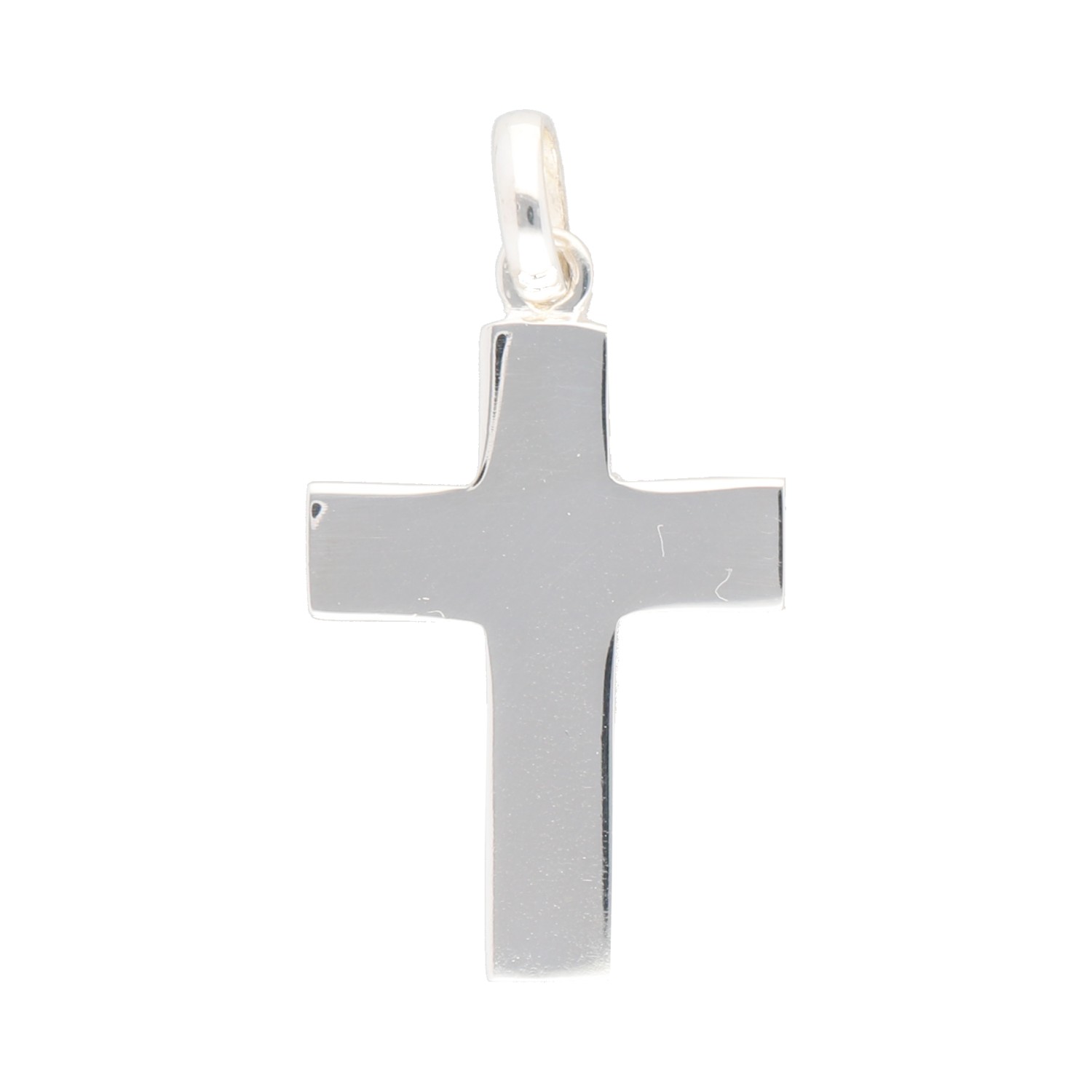 Con unas dimensiones de 35 mm de alto por 25 mm de ancho, esta cruz ofrece una presencia notable en el cuello sin resultar demasiado voluminosa. Su silueta respeta la forma tradicional de la cruz latina, con brazos bien proporcionados y bordes suaves que reflejan la luz con un acabado tipo espejo. La Cruz de Plata 35x25mm es una pieza que combina perfectamente con cadenas de grosor medio, ideal para llevar sola o junto a otros colgantes discretos.